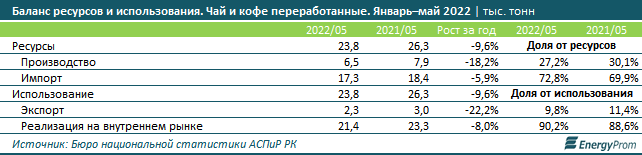 По итогам января–мая 2021 года отечественные производители обеспечили спрос (реализацию на внутреннем рынке плюс экспорт) на переработанные чай и кофе на 27,2%, против 30,1% годом ранее.
