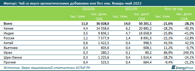 За тот же период (январь–май 2022-го) в страну импортировали 11 тыс. тонн чая со вкусо-ароматическими добавками или без них на сумму 36 млн долл. США. Сокращение в натуральном выражении составило 21,6%, в денежном — 28,2%.