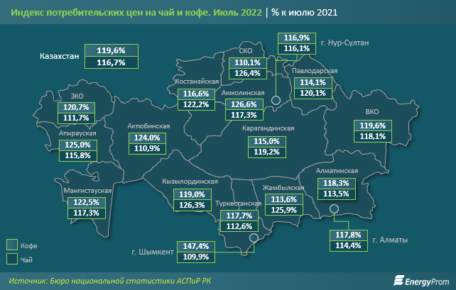 В июле текущего года кофе в РК подорожал на 19,6% за год, чай — на 16,7%.