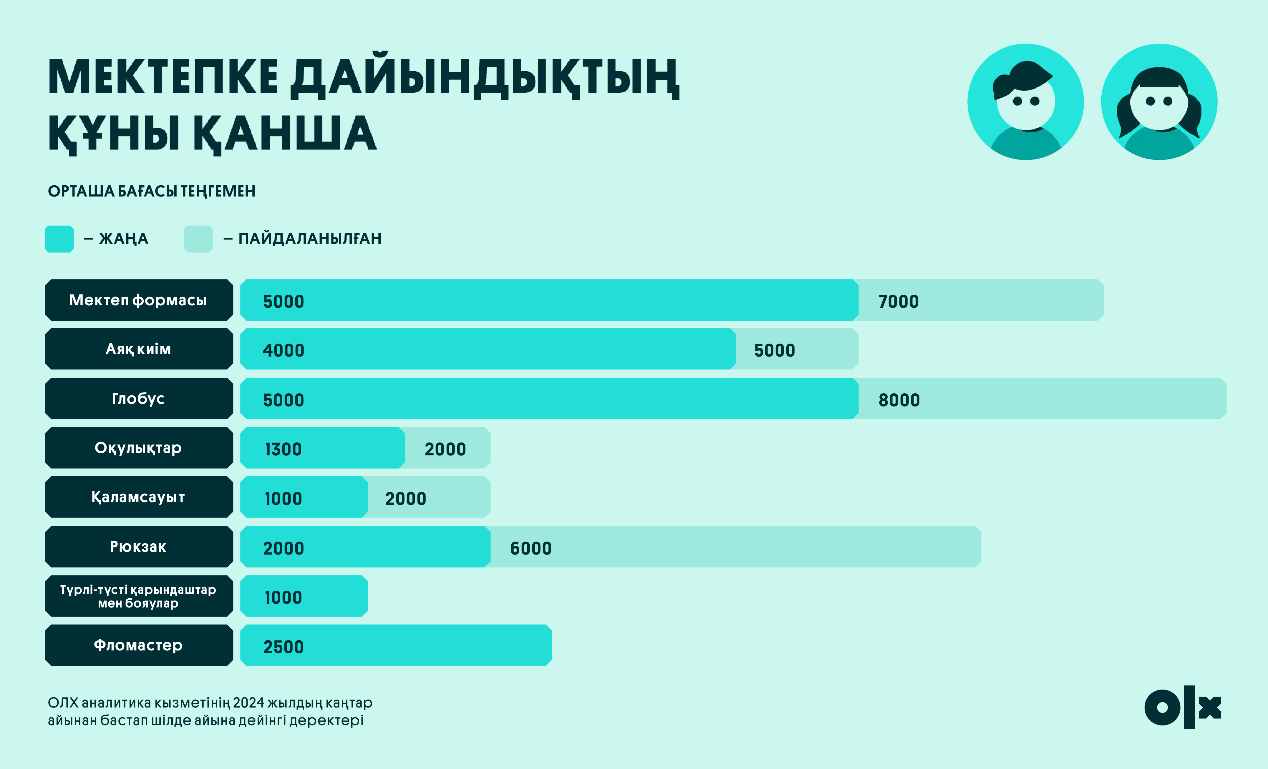 2024 жылға қарай баланы мектепке дайындау үшін қажетті ең төменгі сома 70 000 теңгеге дейін өсті. Мектеп тауарлары бағасының өсуі өндіріс шығындарының өсуіне, инфляцияға және экономикалық ауытқуларға байланысты. Ата-аналар үнемдеудің балама жолдарын іздеуге мәжбүр және сол әдістердің бірі — OLX сияқты онлайн маркетплейстер арқылы тауарларды сатып алу.