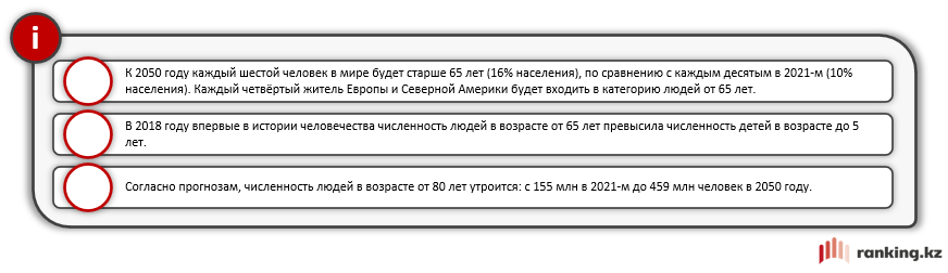 Старение населения — одна из доминирующих тенденций XXI века. Это имеет важные и далеко идущие последствия для жизни общества. Увеличение доли пожилых людей в общей численности населения отмечается практически во всех странах. По прогнозам ООН, в ближайшие десятилетия численность людей в возрасте от 65 лет во всём мире увеличится более чем вдвое: с 761 млн в 2021 году до 1,6 млрд человек в 2050-м. Численность людей в возрасте от 80 лет будет расти ещё быстрее, пишет Ranking.