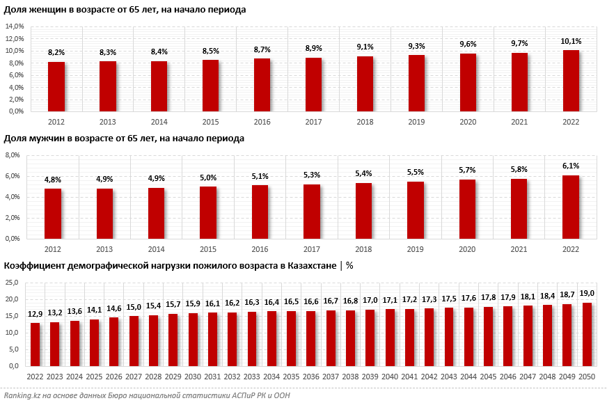 В РК ситуация ровно такая же, как и в целом по миру: наблюдается старение населения. Так, на начало 2022 года доля женщин в возрасте от 65 лет достигла 10,1%, при этом десятью годами она составляла лишь 8,2%. Тем временем доля мужчин в возрасте от 65 лет за десятилетие увеличилась с 4,8% до 6,1%.