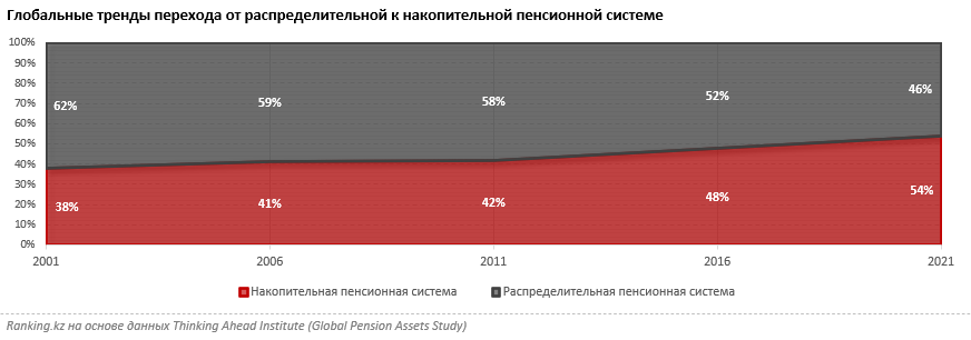 С учётом старения населения в мире наблюдается повсеместный тренд по переходу от распределительной к накопительной пенсионной системе. Так, если ещё в 2001 году доля активов распределительной пенсионной системы составляла 62%, то уже в 2021 году показатель сократился до 46%. Доля активов накопительной пенсионной системы соответственно выросла с 38% до 54%.
