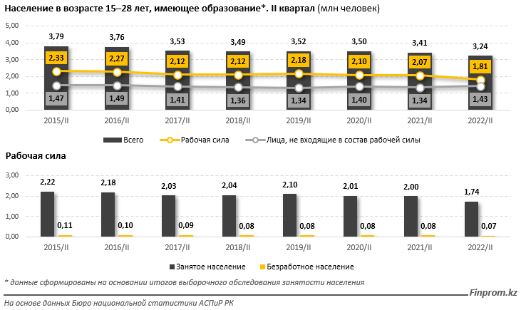 По итогам выборочного обследования занятости населения численность молодых людей в возрасте от 15 до 28 лет, имеющих образование, во втором квартале 2022 года составила 3,24 млн человек — на 5,2%, или на 177,1 тыс. человек, меньше по сравнению с аналогичным периодом прошлого года. К рабочей силе относились 1,81 млн человек — на 12,8%, или на 266,1 тыс. человек, меньше, чем годом ранее. Среди них 1,74 млн составило занятое население, чьё количество уменьшилось на 12,9%, или на 257,1 тыс. человек, а 68,5 тыс. человек — безработное население, которого стало на 11,6%, или на 9 тыс. человек, меньше по сравнению с соответствующим периодом 2021 года. Об этом сообщает Матрица.kz со ссылкой на Finprom.kz.