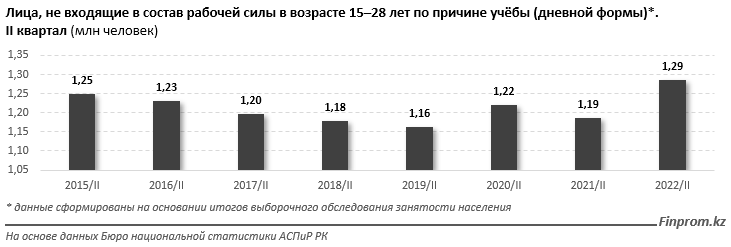 Из 1,43 млн человек в возрасте 15–28 лет, не входящих в состав рабочей силы, 1,29 млн лиц не входят в её состав по причине дневной формы обучения. Их количество за год выросло на 8,3%, или на 98 тыс. человек, по сравнению со вторым кварталом 2021 года.