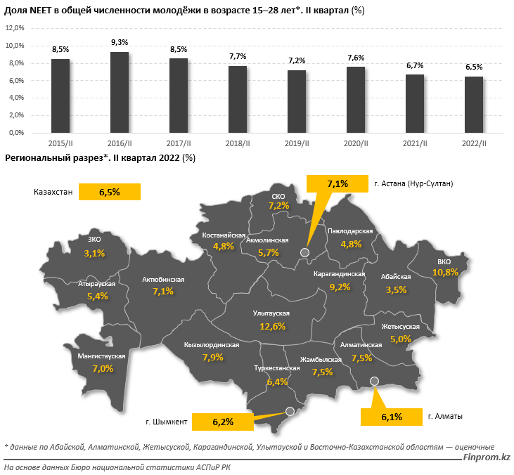 В целом по РК доля молодёжи NEET составила 6,5%.