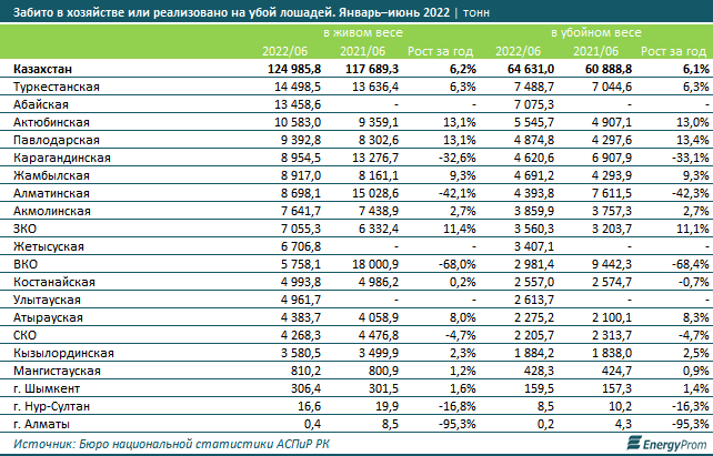 За январь–июнь текущего года в стране было забито в хозяйстве или реализовано на убой 125 тыс. тонн лошадей в живом весе — на 6,2% больше, чем годом ранее. В убойном весе было забито 64,6 тыс. тонн лошадей, плюс 6,1%, сообщает аналитическая служба EnergyProm.