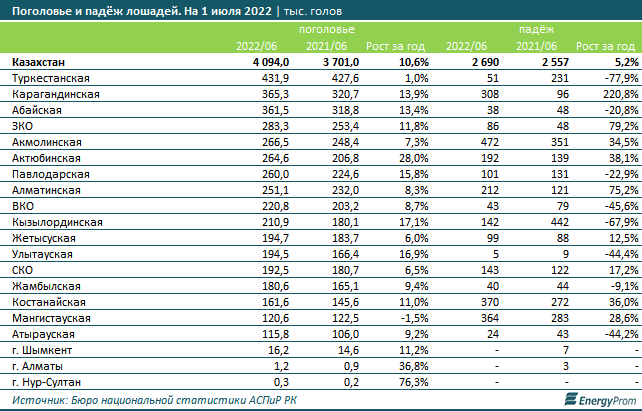 На 1 июля текущего года в стране насчитывалось 4,1 млн лошадей — на 10,6% больше, чем годом ранее. В региональном разрезе по поголовью лошадей лидировали Туркестанская, Карагандинская и Абайская области.