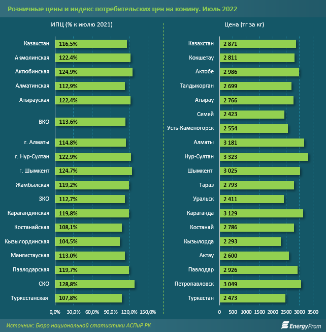 Дороже всего среди крупных городов страны килограмм конины стоил в столице (3,3 тыс. тг), дешевле всего — в Кызылорде (2,3 тыс. тг).