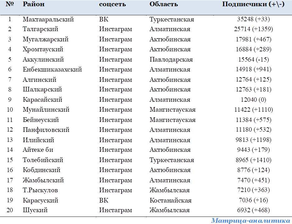 Самая большая неожиданность – это появление в двадцатке Инстаграм Атбасарского района Акмолинской области. Поздравляем!
