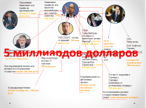 При этом без содействия премьер-министра Арсения Яценюка эти коррупционные схемы, из-за который правительство теряет около $5 млрд, были бы невозможны, считает Михаил Саакашвили. Коррупционные связи Михаил Саакашвили представил в виде презентации с инфографикой.