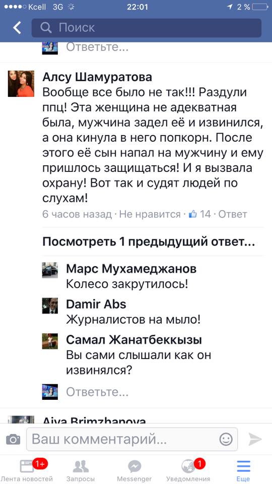 Между тем, Айжан Каримова рассказала, что "семейная пара (мои друзья), проходя мимо нечаянно задели попкорн соседей, который естественно рассыпался под ноги, на что женщина сделала замечание, а молодой человек извинился, и предложил купить ей новый попкрон, но женщина кинула ему покорн в лицо, со словами "да, подавись ты со своим покорном!", на что мой друг кинул остатки попкрон ей обратно (просто защитная реакция, я не думаю что он всерьез стал что-либо кидать в женщину)". Она также сообщила, что "ребенку" пострадавшей, которого она защищала, на вид 25-30 лет, что отчетливо видно на фотографии с места инцидента.