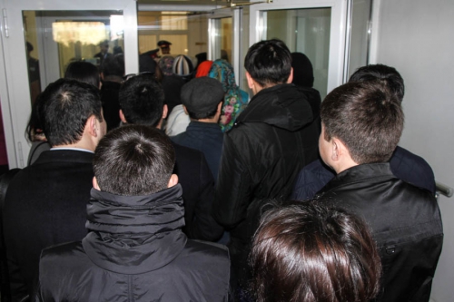 Из-за проверок на наличие смартфона в четвёртом подъезде Дома министерств образовалась большая очередь, передает BNews.kz.