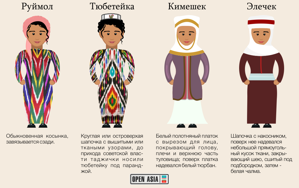 У каждого народа нашего региона действительно богатые традиции женского национального костюма, включающего в себя и головной убор. Но надеть традиционный наряд вряд ли сейчас кто-то отважится. К примеру, на севере Таджикистана еще в начале ХХ века женщины выходили из дома в длинных, широких платьях, шароварах и, помимо повязанного платка, покрывали голову специальной накидкой, похожей на халат с рукавами. В Казахстане традиционно надевали кимешек – головной убор, который плотно облегал голову и закрывал шею, грудь, плечи. В Кыргызстане – элечек, почти то же самое.