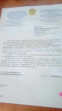Потому что якобы гербария, якобы Генеральной Прокуратуры и якобы Департамента антикоррупционной службы не бывает. Но в действительности они реально существуют, и эти факты подтверждены конкретными документами Генпрокуратуры и Нацбюро с указанием статьи Уголовного Кодекса РК (Фото ниже). В общем, оставим это на совести журналистки, которая не проверила правомерность этих фактов и прикрылась зонтиком «якобы…». А скрины писем вот они - я оперирую лишь фактами.
