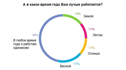 Между тем, 46% респондентов не видят связи между эффективностью труда и сезонностью, уверяя, что всегда хорошо работают. А 17% считают, что лучше всего работается весной.