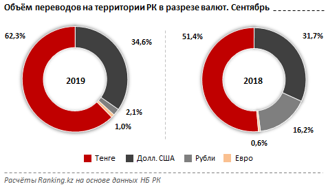Объём переводов денежных средств на территории Казахстана в сентябре текущего года составил 4,5 млрд тг (в сентябре 2018-го — 6,1 млрд тг), при 23,6 тыс. транзакций. В разрезе валют заметно явное преобладание тенге — 62,3% (годом ранее — 51,4%). После тенге казахстанцы чаще всего отправляют внутри страны доллары США: 34,6% всех переводов приходится именно на них. Российский рубль и евро в меньшинстве: 2,1% и 1% соответственно.