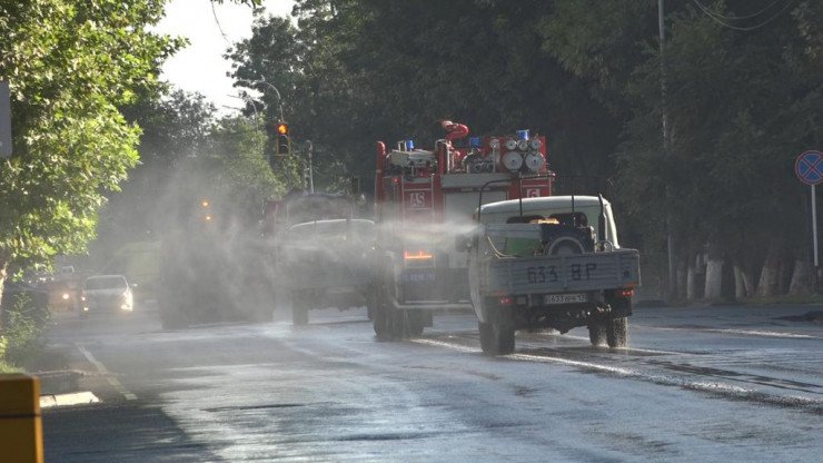 Сонымен қатар, орталық көшелерді арнайы мандандырылған мекемелер техникалармен, ал демалыс орындары,көпқабатты тұрғын үйлердің ауласы, ойын алаңшалары, ішкіорамдық көшелерді әскери қызметшілер мен сервистік мекеме жұмысшылары су бүріккіш жабдықтармен залалсыздандыруда.
