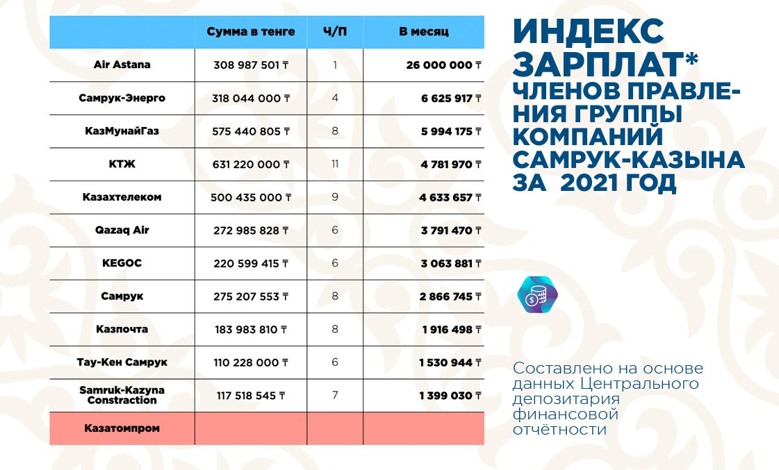 «Сегодня у нас группа компаний Фонда национального благосостояния «Самрук-Казына». Больше всех среди портфельных компаний выделяется Air Astana, где самый высокий уровень вознаграждения. В прошлом году Питер ФОСТЕР получил 288,4 млн тенге», — указывается в сообщении.