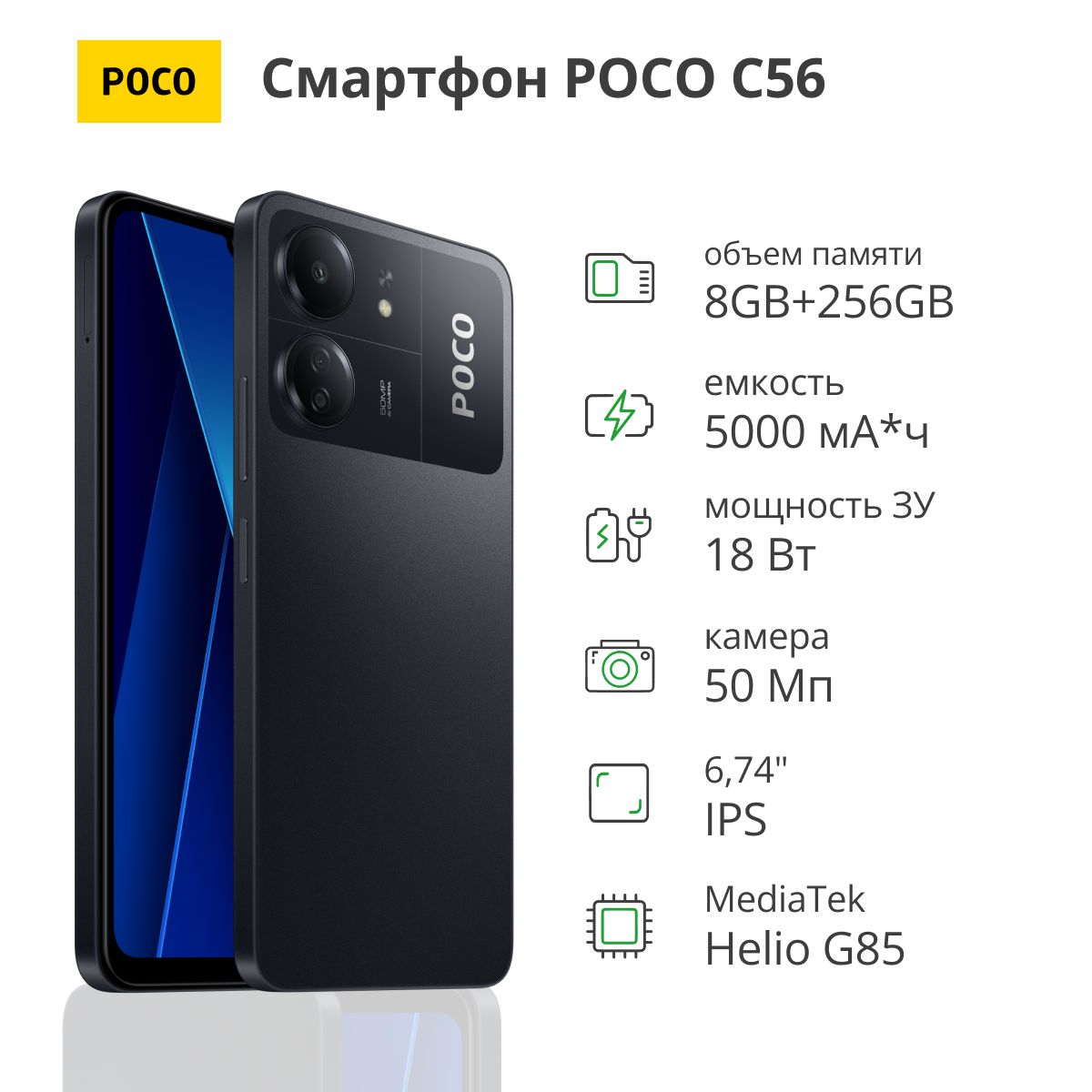 POCO C65 радует невероятно большим дисплеем, мощным процессором, тройной камерой 50 Мп с искусственным интеллектом и большим объемом памяти