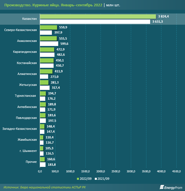 За январь–сентябрь 2022 года производство яиц в РК составило 3,8 млрд штук — на 5,3% больше, чем годом ранее.