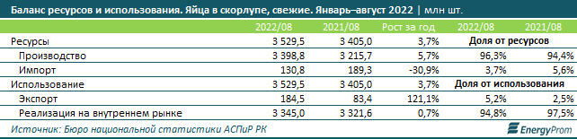 По итогам января–августа текущего года местные компании обеспечили спрос (реализацию на внутреннем рынке плюс экспорт) на свежие яйца в скорлупе на 96,3%, против 94,4% годом ранее.