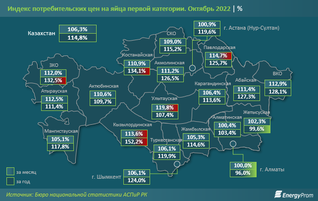В годовой динамике яйца подорожали сразу на 52,2% в Кызылординской области, на 34,1% — в Костанайской, на 32,5% — в Западно-Казахстанской. При этом в Алматы цены, напротив, снизились на 4%, а в Жетысуской области — на 0,4%.