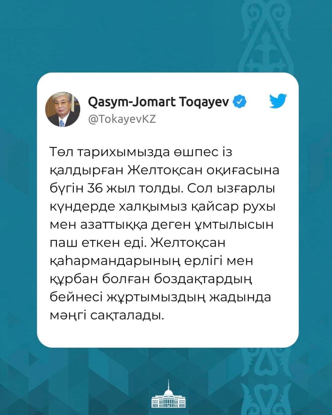 «Төл тарихымызда өшпес із қалдырған Желтоқсан оқиғасына бүгін 36 жыл толды. Сол ызғарлы күндерде халқымыз қайсар рухы мен азаттыққа деген ұмтылысын паш еткен еді. Желтоқсан қаһармандарының ерлігі мен құрбан болған боздақтардың бейнесі жұртымыздың жадында мәңгі сақталады», — делінген жазбада.