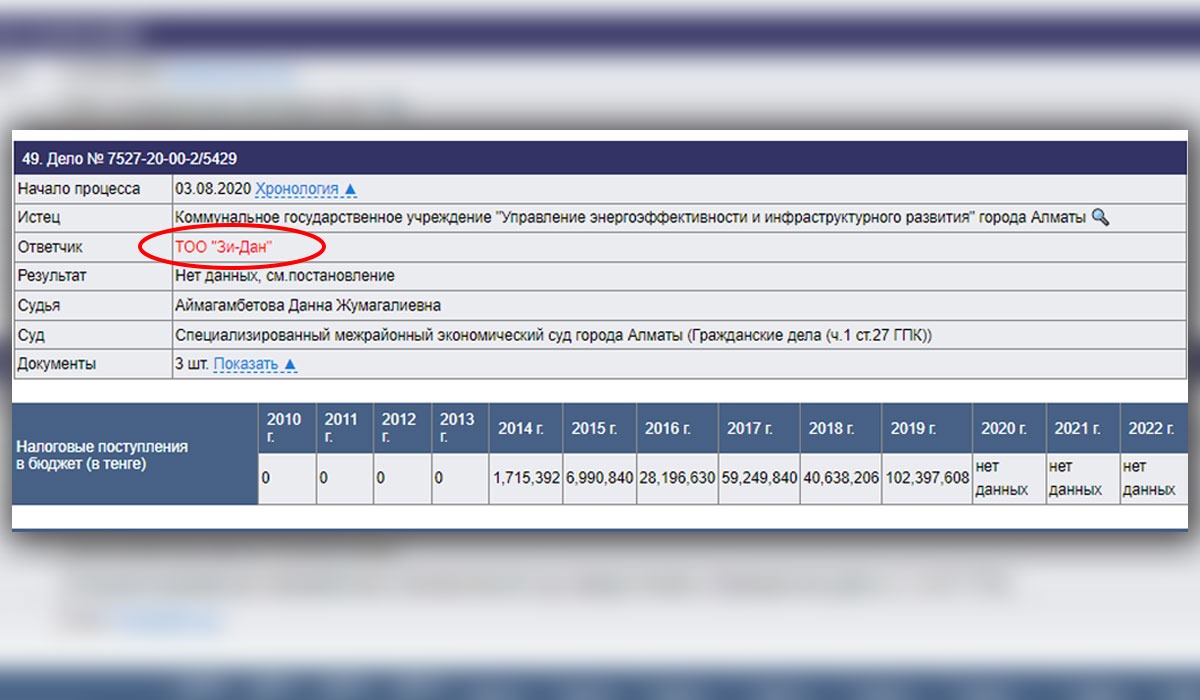 Ашық дереккөзге сүйенсек, «Зи-дан» ЖШС нарықта 20 жылдан бері жұмыс істеп келеді. Осы уақыт аралдығында компанияның үстінен әртүрлі себеппен сотқа 33 рет арыз түскен. Соңғы шағымды 2020 жылы Алматы қаласының Энерготиімділік және инфрақұрылымдық даму басқармасы түсіріпті.