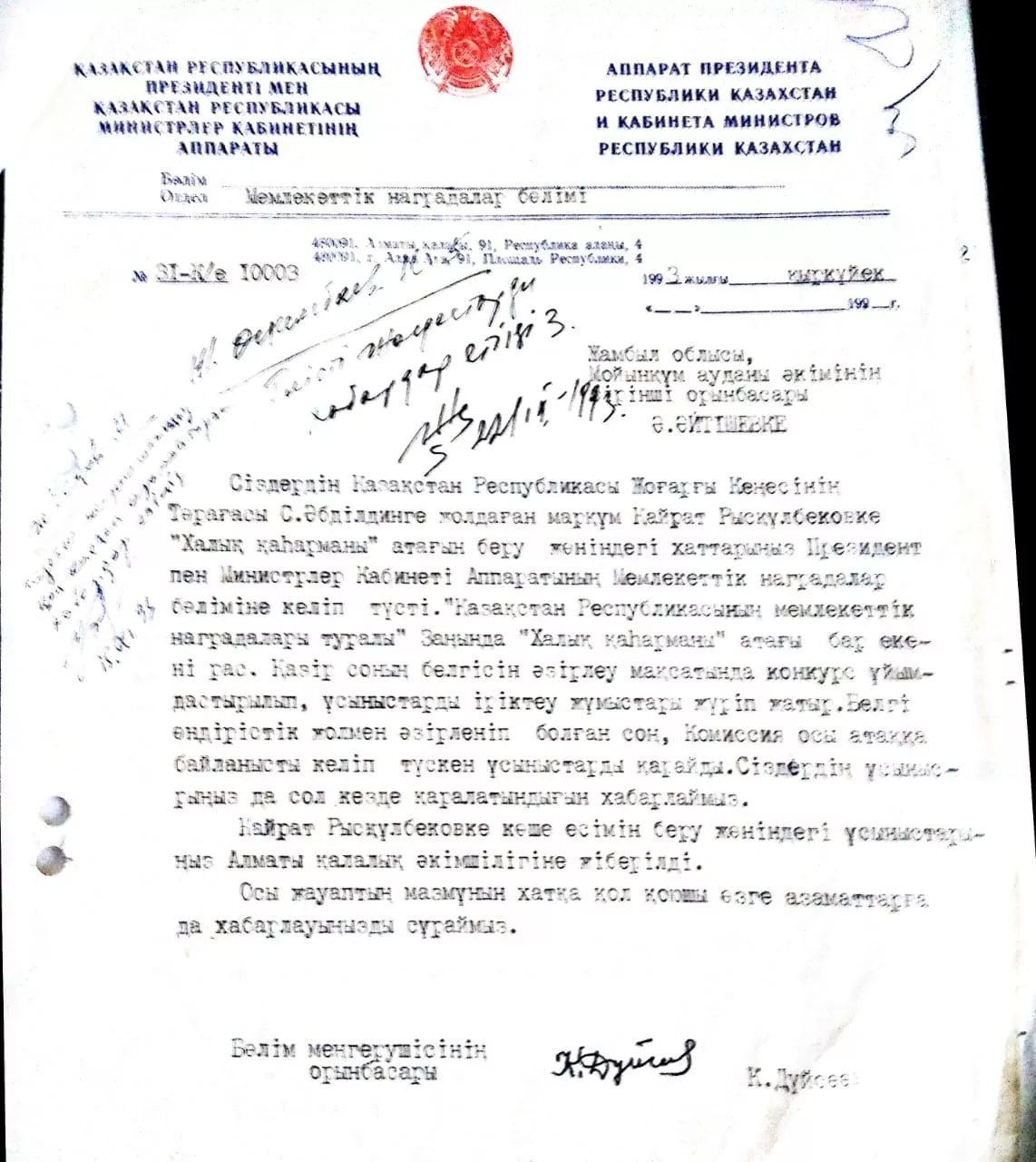 Мәкен Уақтегі: 1993 жылы шілденің аяғында Семей сапарында жүргенімде БАҚ беттерінде «Коммунар Табейдің — Қайратқа құн есебінде 31 миллион сом ақша берілетін болды» деген хабары шыға бастады. Ауылға оралған соң, анасы Дәметкеннен «Қайраттың құны төленетін болды деп, газеттерде шыға бастағаны қалай?» деп сұрағанымда, ол кісі «материалдық көмек ретінде берілетін болды» деді. Бірақ, содан бастап Қайрат қорына қаражат түспей тоқтап қалды. Жанашыр жігіттер «Қайраттың әруағы саған риза шығар, қордың жұмысын тоқтатқаның жөн болар, құн төленгеннен соң, оны даулау қисыныз» деді. Осындай әрекеттерге қарамастан Қайрат Рысқұлбеков атындағы орта-мектеп ұжымының қолдауымен облыс пен аудандағы қоғамдық ұйым өкілдерінің 150-ге жуық адамның қол қоюларымен бұрынғы президент Н.Назарбаев пен сол кездегі Жоғарғы Кеңес төрағасы С.Әбділдиннің аттарына Қайраттың өміріне қастандық жасалғаны жайлы жазып «келешекте болашақ ұрпақтардың алдында мерейіміз жарқын болсын десек, ең жоғарғы — Халық қаһарманы атағы берілуін, және жас боздақтар Ербол, Ләззат, Сәбираны да ұмыт қалдырмауларыңызды сұранамыз» деп, хат дайындап жібердік. Көп кешікпей біздің ұсынысымыз қолдау тауып, 1993 жылы қыркүйекте «Мемлекеттік наградалар бөлімі» меңгерушісінің орынбасары К. Дүйсеевтен оңды жауап та келді. 1996 жылдың 9-желтоқсанында президент Жарлығымен Қайрат Рысқұлбековке «Халық Қаһарманы» атағы берілді.