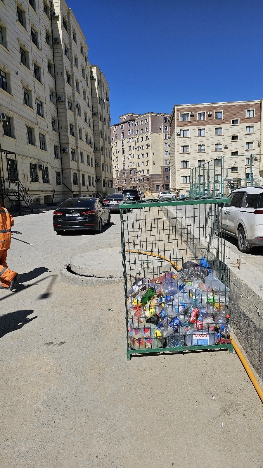 Фотосурет: Ақтау қаласы, «Асқартау» тұрғын үй кешенінің аумағынан пластик қалдықтарды жинауға арналған мамандандырылған торлы контейнер |
