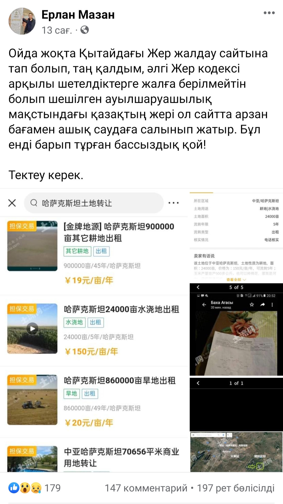 «Ойда жоқта Қытайдағы Жер жалдау сайтына тап болып, таң қалдым. Әлгі Жер кодексі арқылы шетелдіктерге жалға берілмейтін болып шешілген ауылшаруашылық мақсатындағы қазақтың жері сол жерде арзан бағамен ашық саудаға салынып жатыр. Бұл енді барып тұрған бассыздық қой!», — деп ашуға булыққан еді желі белсендісі.
