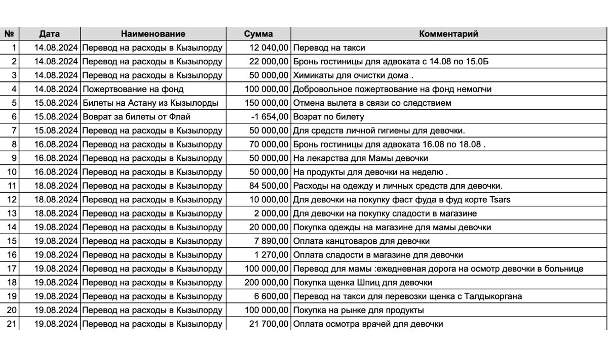 Қыздың таксидегі ақшасы, қонақ үйдегі броны, билетінен басқа олар 100 мың теңгені НеМолчи қорына аударған. Қызын күнде ауруханаға апару үшін анасына тағы 100 мың теңге аударған. Және оқушы қызға 200 мың теңгеге шпиц тұқымды күшік сатып алып берген. Тағы 100 мың теңгені азық-түлігіне аударған.