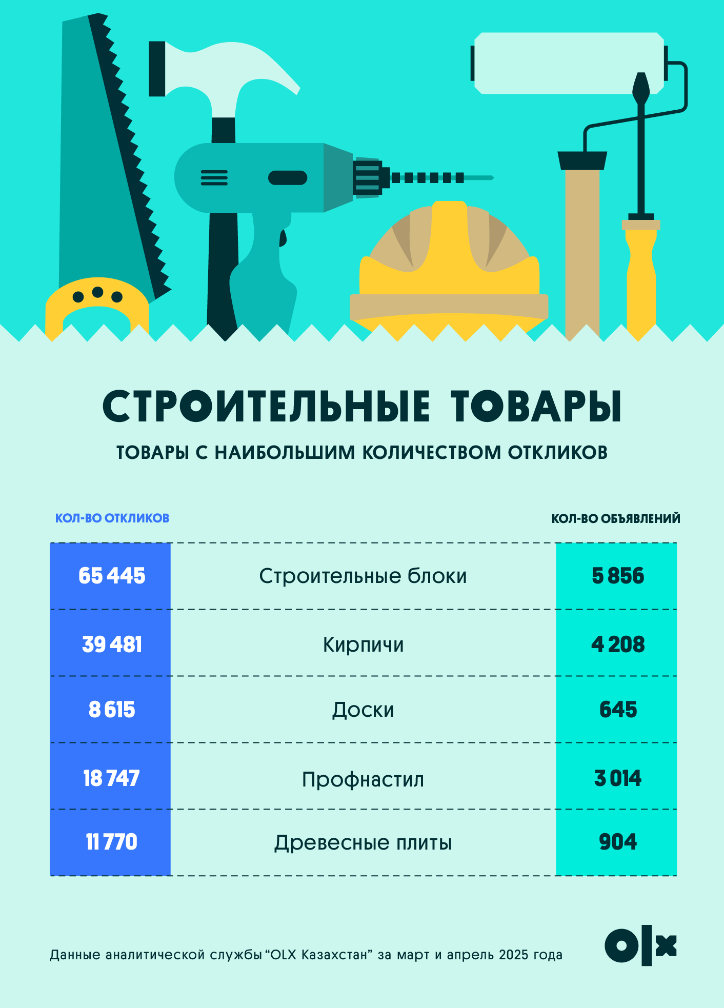 С наступлением тепла в Казахстане традиционно начинается строительный сезон. Люди начинают закупать материалы, искать мастеров и арендовать технику, чтобы успеть закончить работы до осени. По данным аналитической службы OLX за весну 2025 года, интерес к строительной тематике заметно вырос: пользователи активнее откликаются на объявления, размещают новые предложения и фильтруют поиск по нужным категориям.