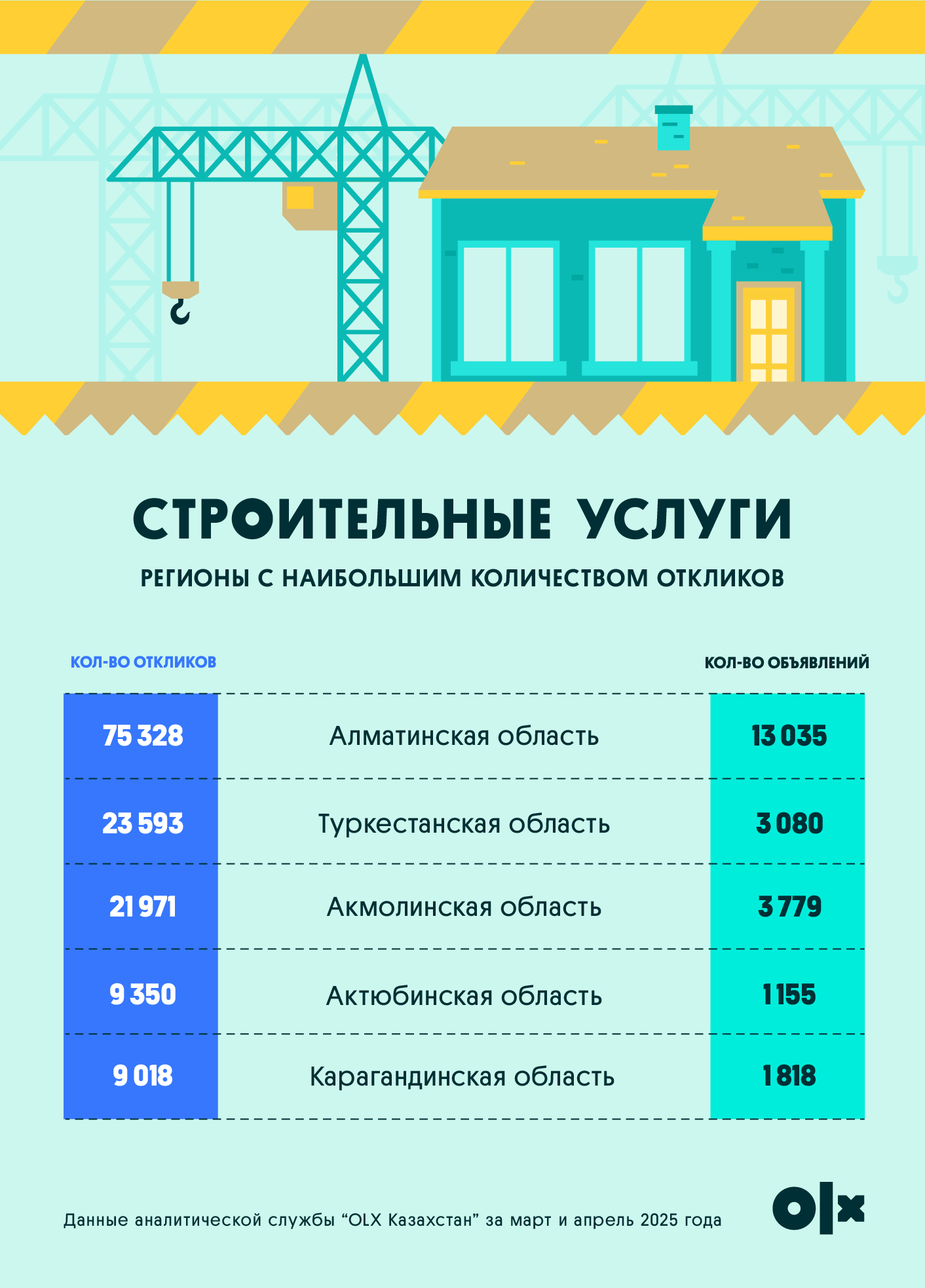По регионам безусловным лидером на строительные услуги остается Алматинская область, где зафиксировано более 75 тысяч откликов. Это почти в три раза больше, чем в следующем по активности регионе — Туркестанской области (около 23,5 тысяч). Далее идут Акмолинская (21 тысяч), Актюбинская, Карагандинская, и Жамбылская области. Рост активности по всей стране говорит о том, что сезонные работы стартовали повсеместно.