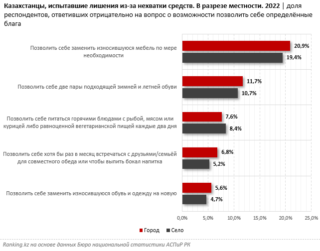 Так, не могут позволить заменить по мере необходимости изношенную мебель 20,9% горожан, против 19,4% сельчан. Не имеют хотя бы по две пары подходящей зимней и летней обуви 11,7% горожан и лишь 10,7% сельчан, а заменить износившуюся обувь и одежду на новую не могут 5,6% горожан, против 4,7% сельчан. Кроме того, возможности встречаться с друзьями или семьёй хотя бы раз в месяц за столом не имеют 6,8% горожан и 5,2% сельчан.