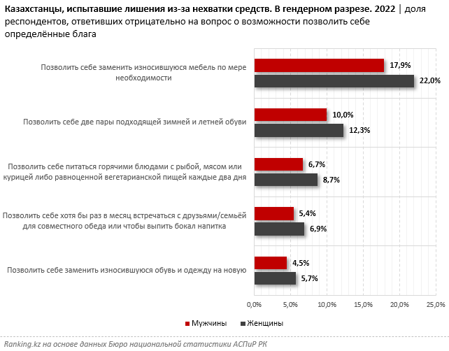 В гендерном разрезе женщины испытывают лишения из-за нехватки средств чаще, чем мужчины. Самый значительный разрыв наблюдается среди тех, кто не может позволить себе заменить ветхую мебель: 17,9% мужчин и сразу 22% женщин.