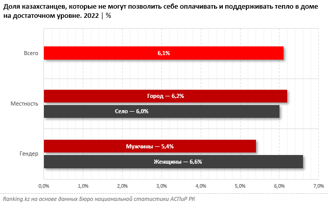 Кроме того, 6,1% казахстанцев не могут позволить себе оплачивать и поддерживать тепло в доме на достаточном уровне.