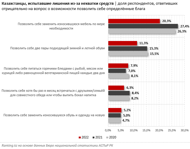 Доля казахстанцев, которые в течение 12 месяцев испытывали некоторые лишения, заметно сократилась, хотя сами показатели всё ещё высоки, пишет аналитическая служба Ranking. Так, среди респондентов, участвовавших в ежегодном исследовании БНС АСПиР РК, доля тех, кто из-за нехватки средств не мог позволить себе заменить старую мебель, сократилась с 27,4% в 2021 году до 20,3% в 2022-м.