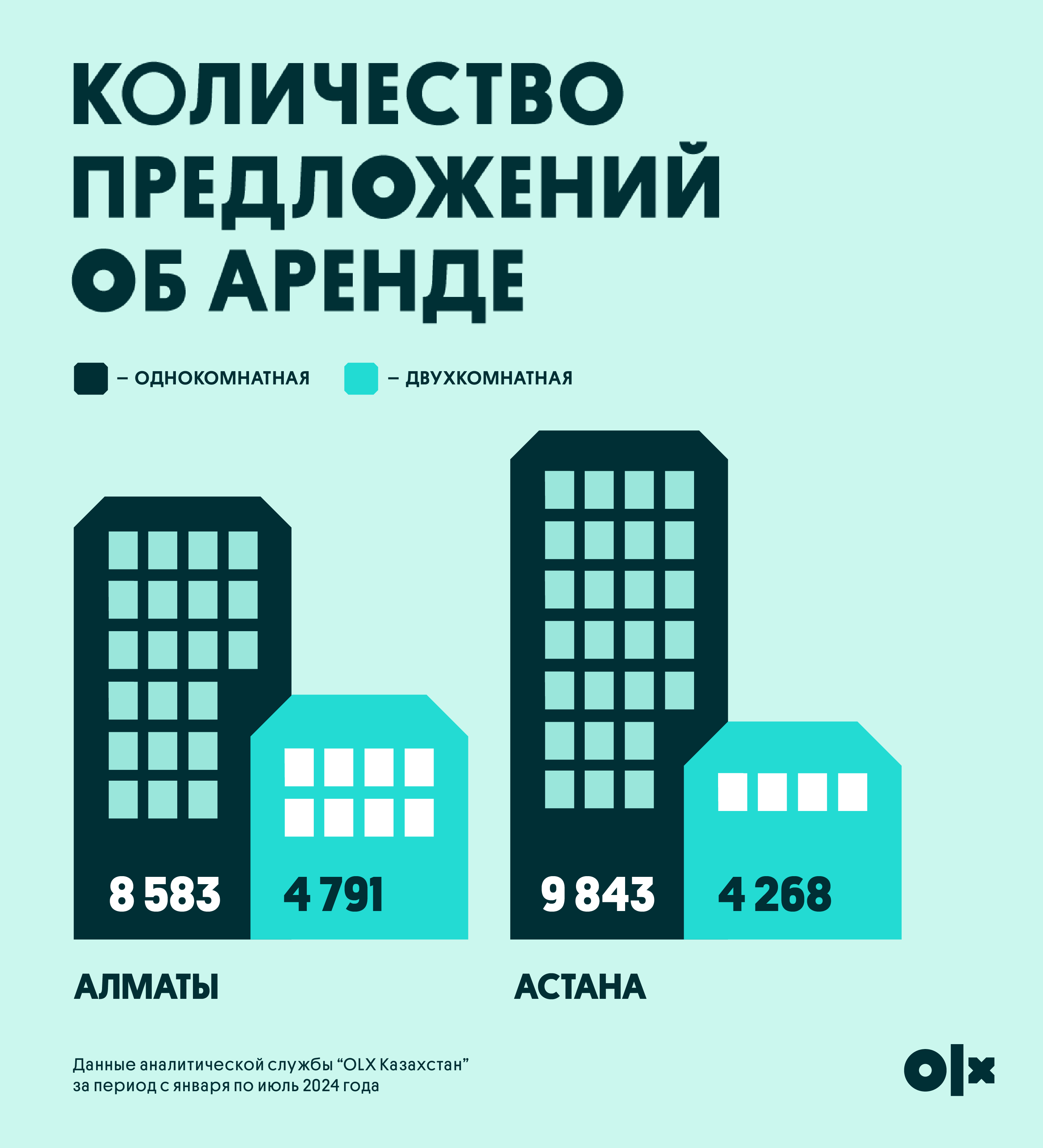 Согласно актуальным данным OLX.kz, рынок аренды жилья в Астане также демонстрирует активность и разнообразие предложений. На текущий момент потенциальным арендаторам доступно 9 843 варианта однокомнатных квартир и 4 268 вариантов двухкомнатных.