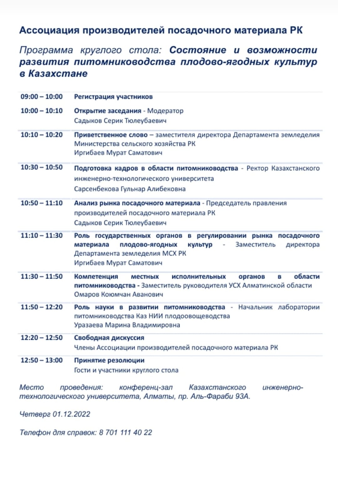 В четверг 01.12.2022 года, в офлайн (живом) формате состоится круглый стол « *Проблемы развития питомниководства плодово-ягодных культур в Казахстане»*