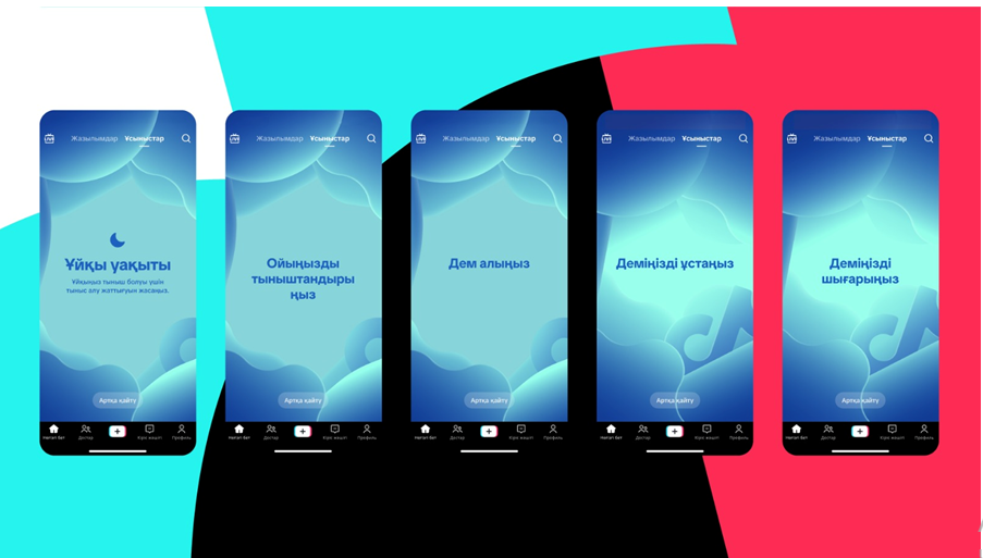 TikTok жасөспірімдерді түнгі уақытта қолданбадан дем алуға және оны пайдаланудың саналы болуына ынталандыратын жаңа функцияны енгізеді. Егер жасөспірім 22:00-ден кейін TikTok-ты ашса, тыныш әуен қосылып, оның экранында демалыс уақыты туралы ескерту шығады.