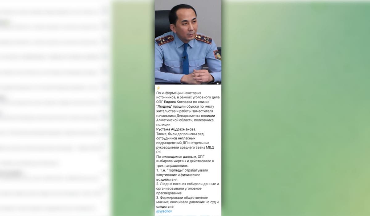 «По информации некоторых источников, в рамках уголовного дела ОПГ Елдоса Коспаева по кличке «Людоед» прошли обыски по месту жительства и работы заместителя начальника Департамента полиции Алматинской области, полковника полиции Рустама Абдрахманова», — пишет он в своем Telegram-канале Yedilov online.