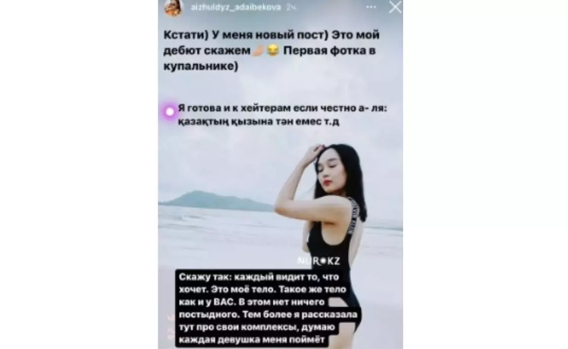 «Бұл мен үшін дебют болды. Шомылатын киімдегі алғашқы суретім. «Қазақ қызына тән емес» деп сын айтушыларға дайынмын. Әркім көргісі келетін нәрсені көреді. Бұл менің денем. Сіздер де дене бар. Ұят ештеңесі жоқ. Оның үстіне мен өз кемшіліктерім туралы айтып бердім. Кез келген қыз мені түсінеді деп ойлаймын», — деп жазды блогер ару.