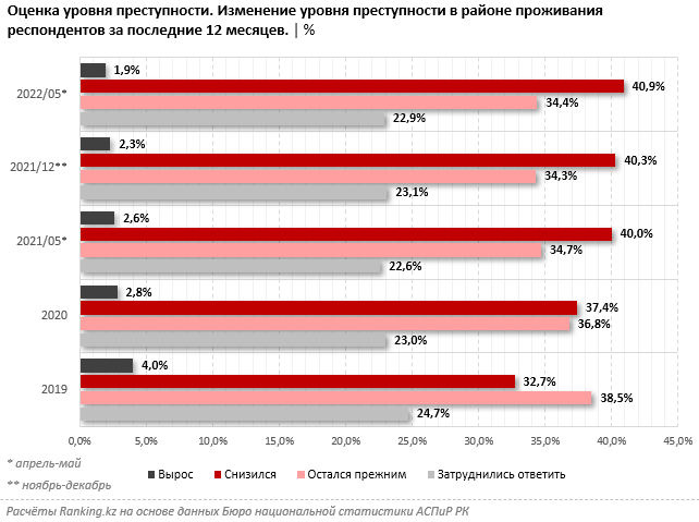 Доля респондентов, считающих, что уровень преступности снизился, выросла с 40% до 40,9%. Доля респондентов, отметивших, что уровень преступности остался без изменений, сократилась с 34,7% в апреле-мае 2021 года до 34,4% в аналогичном периоде 2022-го.
