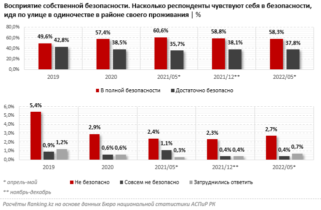 Согласно выборочному обследованию уровня доверия населения РК к правоохранительным органам, которое проводилось в апреле-мае 2022 года во всех регионах РК, в полной безопасности, идя по улице в одиночестве в районе своего проживания, чувствуют себя 58,3% опрошенных, сообщает аналитическая служба Ranking.