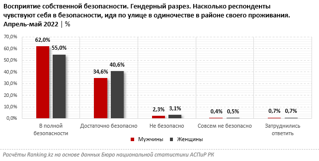 В гендерном разрезе полную безопасность, идя по улице в одиночестве в районе своего проживания, ощущают 62% мужчин и 55% женщин. При этом достаточно безопасно себя чувствуют 40,6% женщин и 34,6% мужчин.