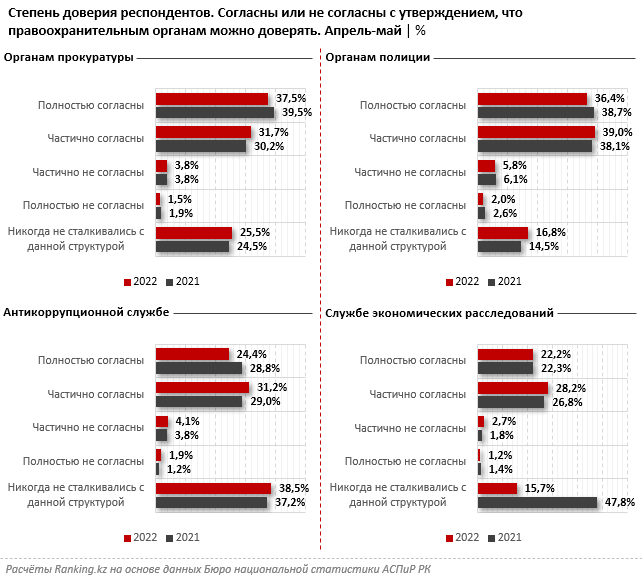 Степень полного доверия респондентов к правоохранительным органам за год уменьшилась, составив по результатам опроса в апреле-мае 2022 года 37,5% для органов прокуратуры, 36,4% для полиции, 24,4% для антикоррупционной службы и 22,2% для службы экономических расследований.