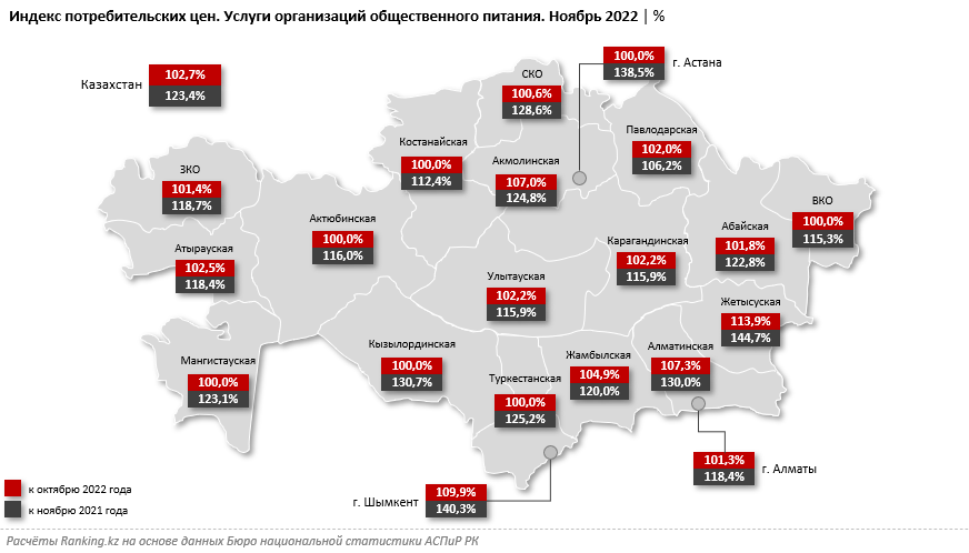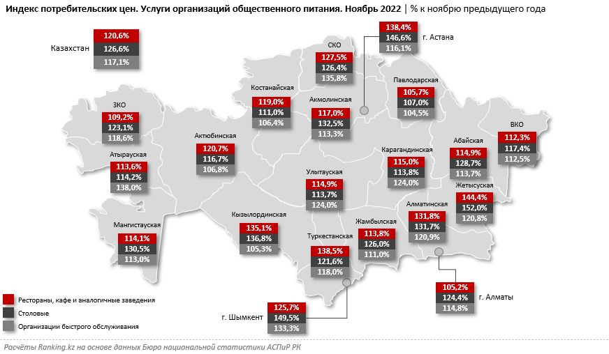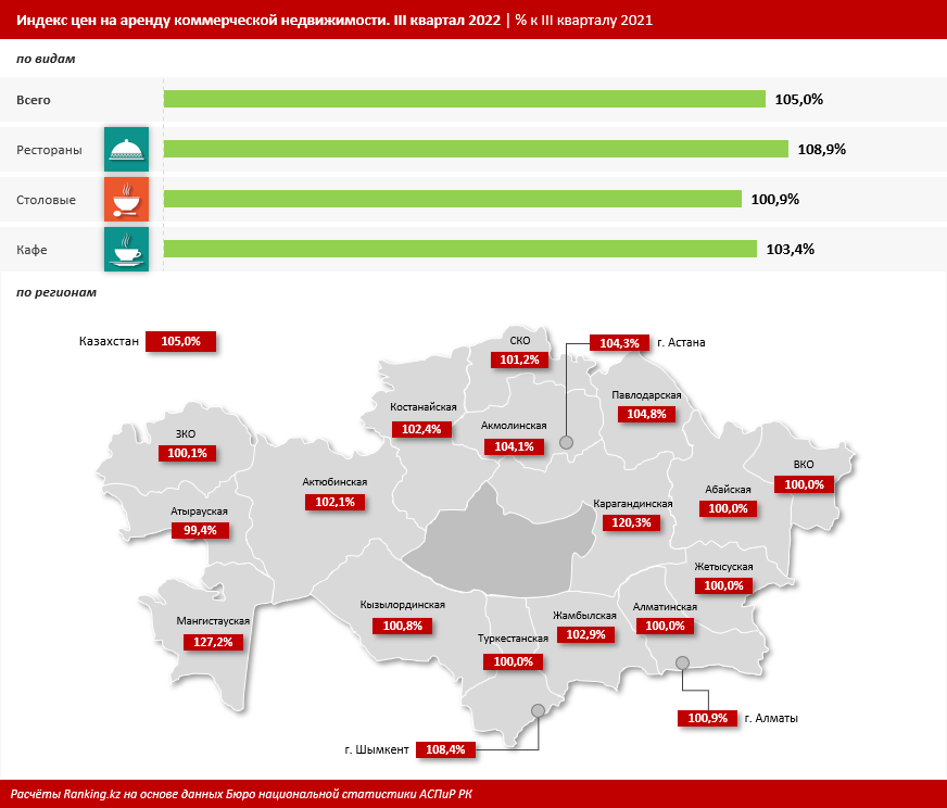 В то же время по итогам третьего квартала 2022 года стоимость аренды ресторанов и пунктов общественного питания увеличилась на 5% за год. Сразу на 27,2% выросли цены в Мангистауской области, на 20,3% — в Карагандинской, на 8,4% — в Шымкенте. Ещё в пяти регионах цены остались на том же уровне, что и годом ранее, а в Атырауской области отмечено даже небольшое удешевление — на 0,6%.