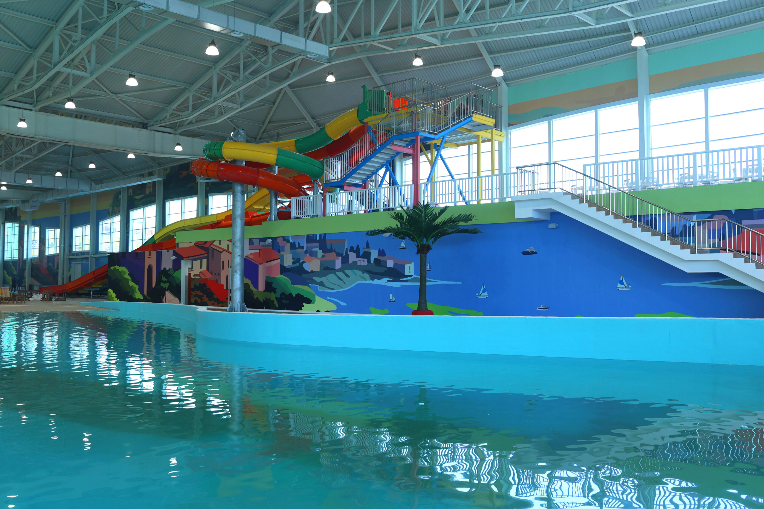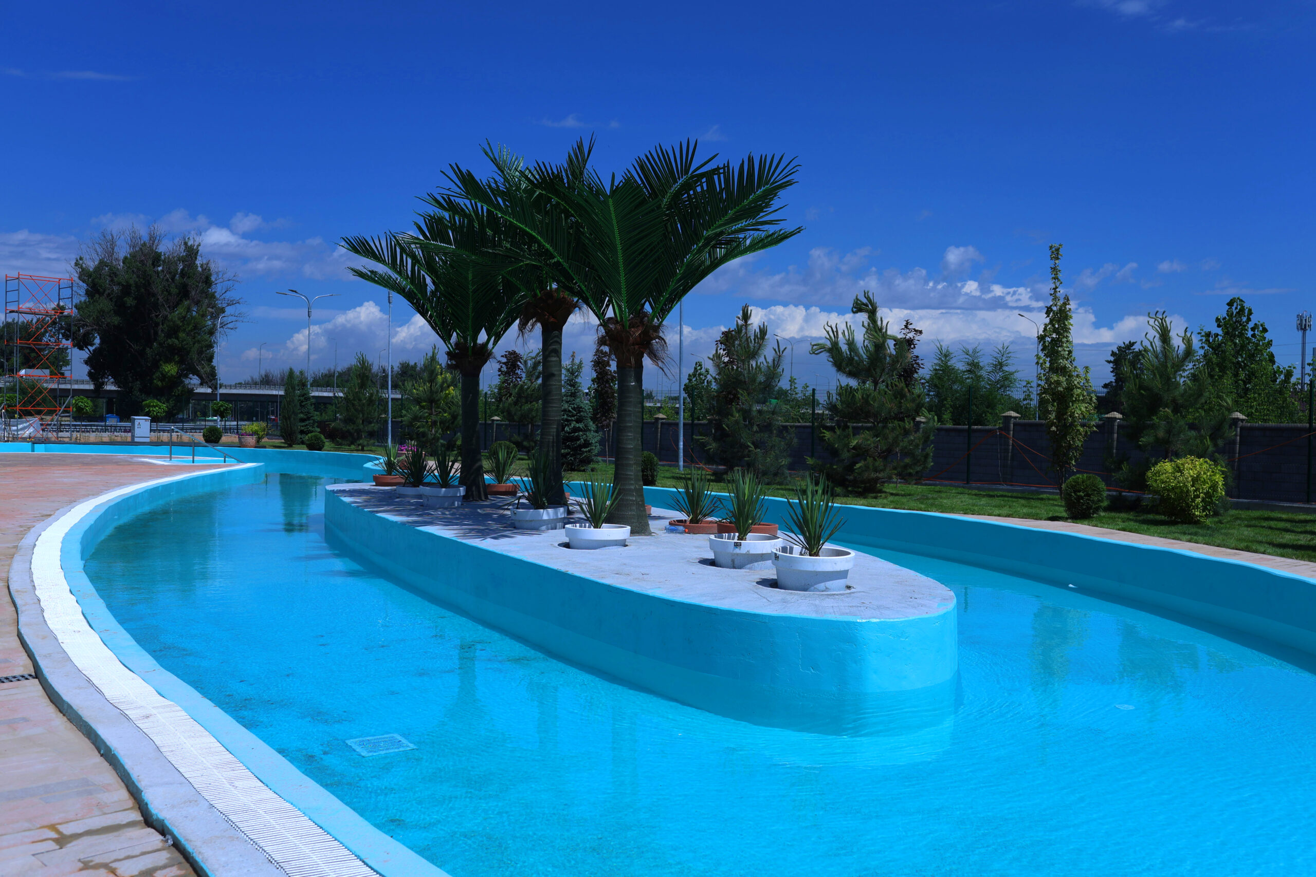 Аквапарк представлен крытой и открытой территорией. Крытая часть состоит из трех бассейнов, в числе которых волновое море площадью 1 500 кв.м., водные аттракционы и уникальная SPA-зона. В летней части аквапарка – три бассейна, включая уникальный для й Центральной Азии аттракцион «Медленная река». Для самых маленьких гостей создана специальная спрей-зона, площадка, оснащенная водными игровыми элементами. Они создают различные водные эффекты: водные струи, водный туман и другое. Использование подобной зоны без бассейна позволяет создать для детей с особыми потребностями (инвалидов-колясочников) доступную для общения со своими сверстниками среду.